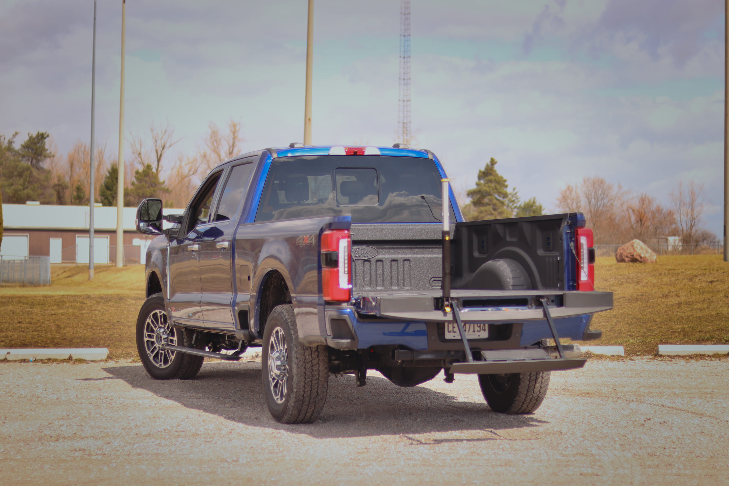 Then there are the quirks, Because this is the Platinum trim, Ford has hidden the “work” behind a layer of satin-chrome jewelry. You get integrated box-side steps and corner bumper steps—practical, if slightly unsightly, notches cut into the bodywork—because the tailgate is so high off the ground that an average human needs a ladder to see inside. The Platinum also adds power-deployable running boards that drop down to bridge the gap between the pavement and cabin, and a power tailgate with a built-in step that feels like a piece of Transformer tech.